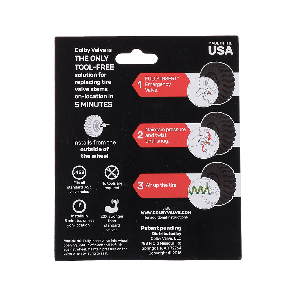 Colby Valve Emergency Valves offer a tool-free installation from the outside of the wheel, in about 1 minute. These are .453 size, and will fit almost everything from riding lawn mowers to truck tires.